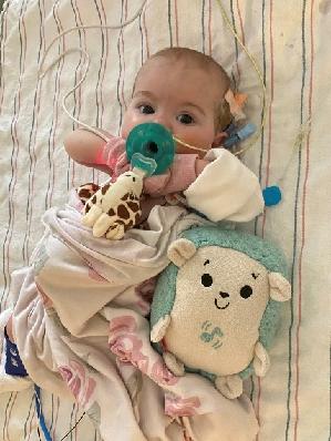 Aria unexpectedly suffered cardiac arrest 3 times following a common surgical procedure to place a broviach and g-tube, which was followed by a lifesaving procedure to place her on ecmo. She suffered multiple major strokes and many seizures. Again, the odds were stacked up against her. Neurology was now concerned she would face vision and movement problems, as well as an inability to communicate with the outside world. And, again, Aria began proving everyone wrong with her steadfast resilience. Aria was now capable of moving all of her extremities, look at and follow objects, recognize when your in the room even if you are silent, track objects and people as they move left and right and more. Aria was showing everyone that even though she had suffered multiple major strokes, which would have caused many impairments, she wasn’t done and sitting back and calling it quits wasn’t an option. Aria has definitely proven herself to be an angel sent from above by touching the hearts and minds of many at both BCH and through those following her unique story on Facebook.
